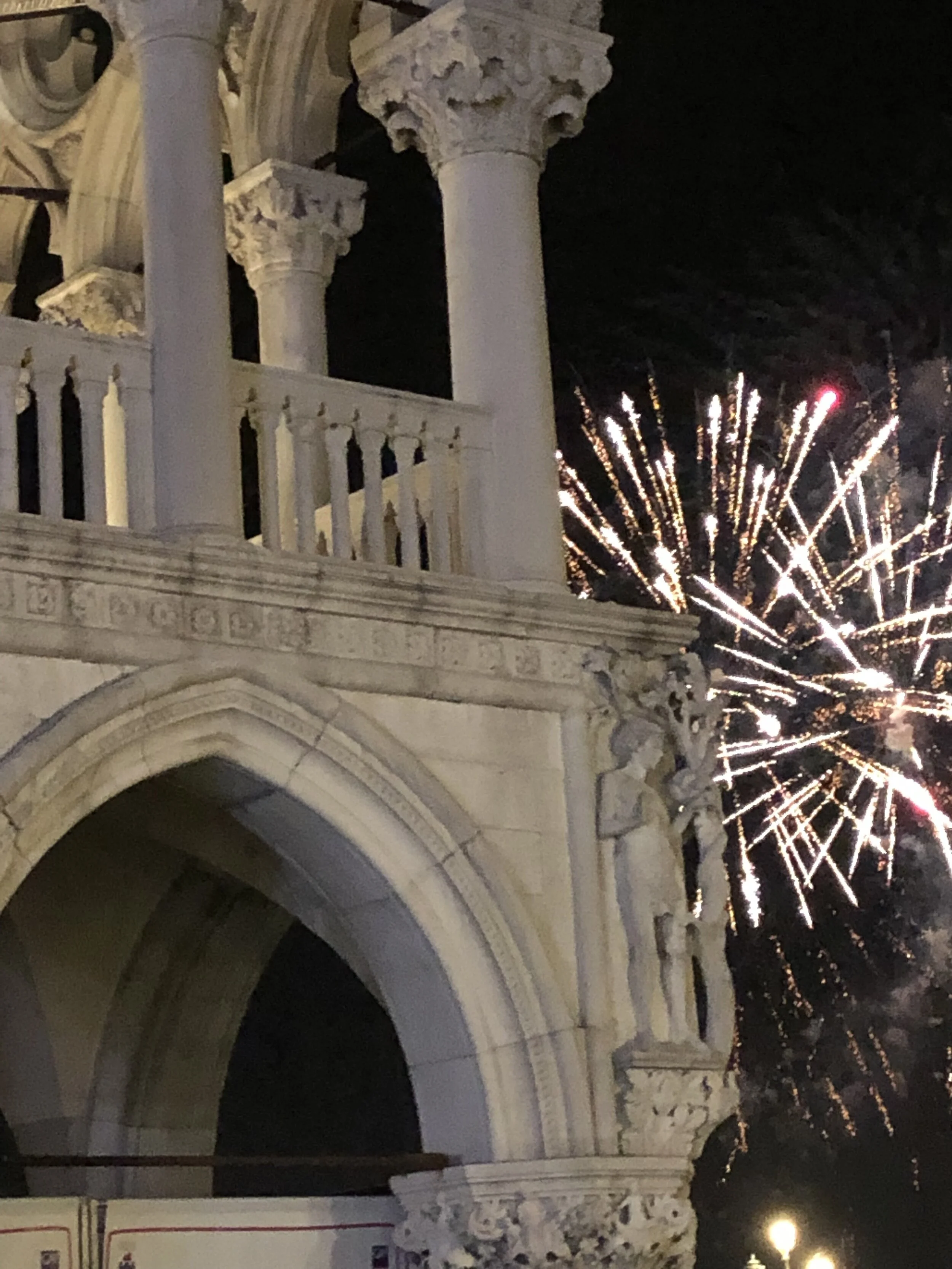 Dawning upon the new year, we returned to the piazza, which was lit up not only by the much anticipated fireworks over the water, but the entire Basillica and hallways surrounding it were lit up with more lights than a midnight mass.